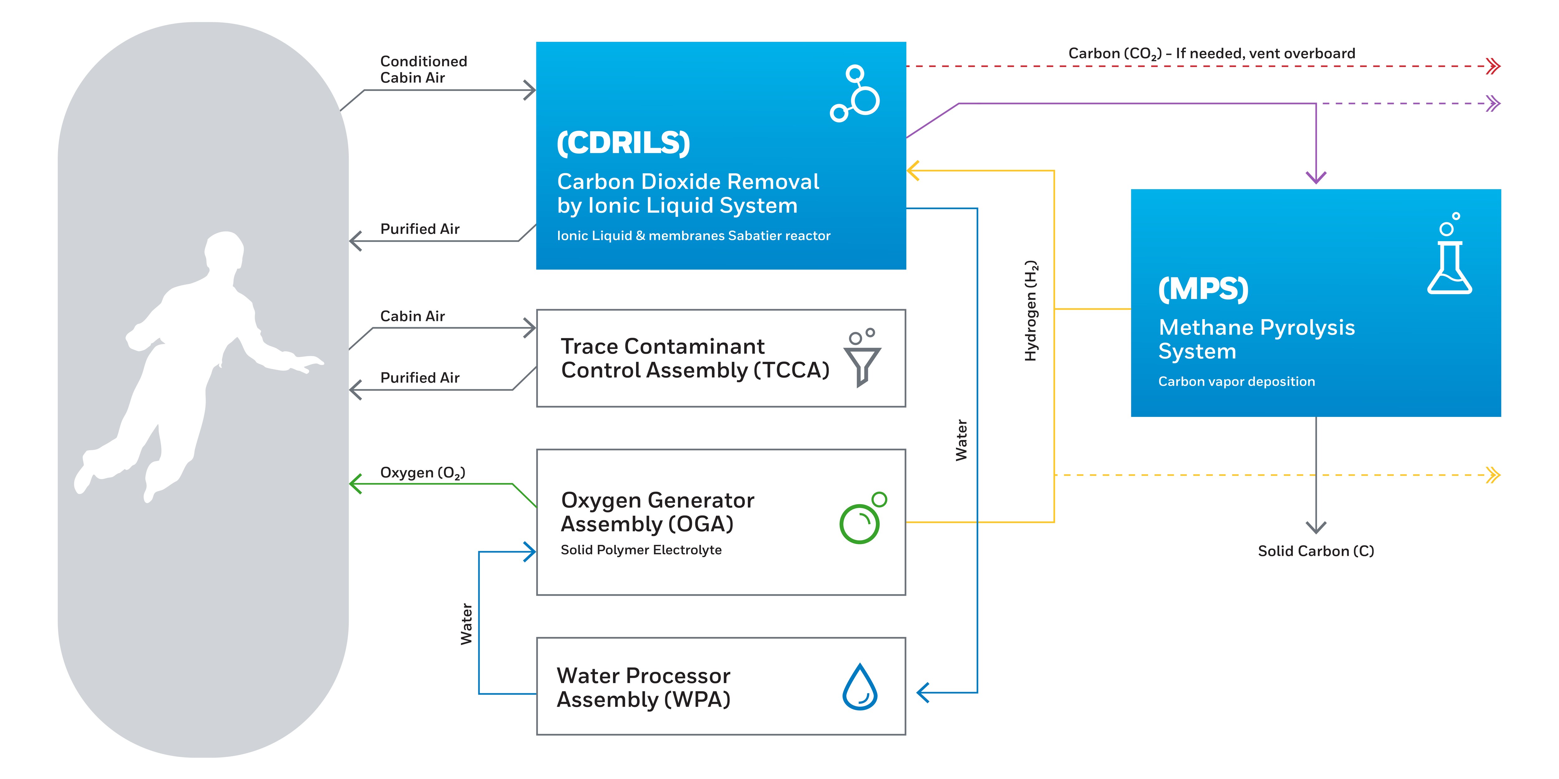 Honeywell’s next-generation Air Revitalization Systems (ARS) deliver continuous, scalable and contaminant-tolerant, life support for harsh space environments. Built on decades of CO₂-removal expertise and full-scale prototype testing, our systems combine Carbon Dioxide Removal by Ionic Liquid System (CDRILS) and Methane Pyrolysis (MP) to recover nearly 100% of oxygen while tolerating humidity and trace contaminants for space stations, lunar habitats and deep-space missions.