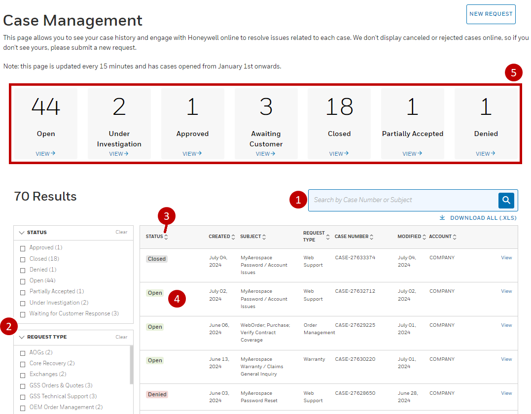 - Filter cases based on Status, Request Type, and Date Range (2).