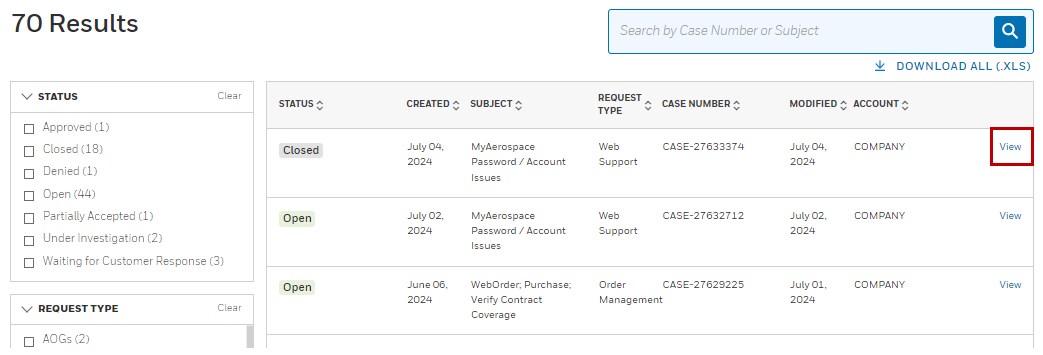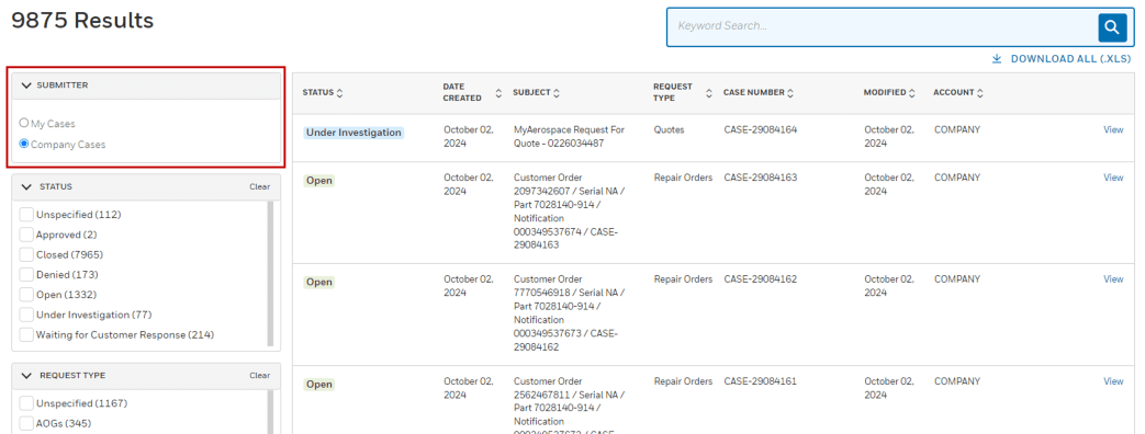 Users have the ability to view and add comments and attachments to online cases that are linked to their own company. Simply switch to the Company Cases view using the SUBMITTER filter. To go back to your own cases, select My Cases from the same filter section.