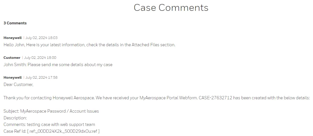 In the Case Detail page for the selected case, please refer to the Attached Files section to view a comprehensive list of attachments, which includes files shared by Honeywell as well as files you have uploaded.